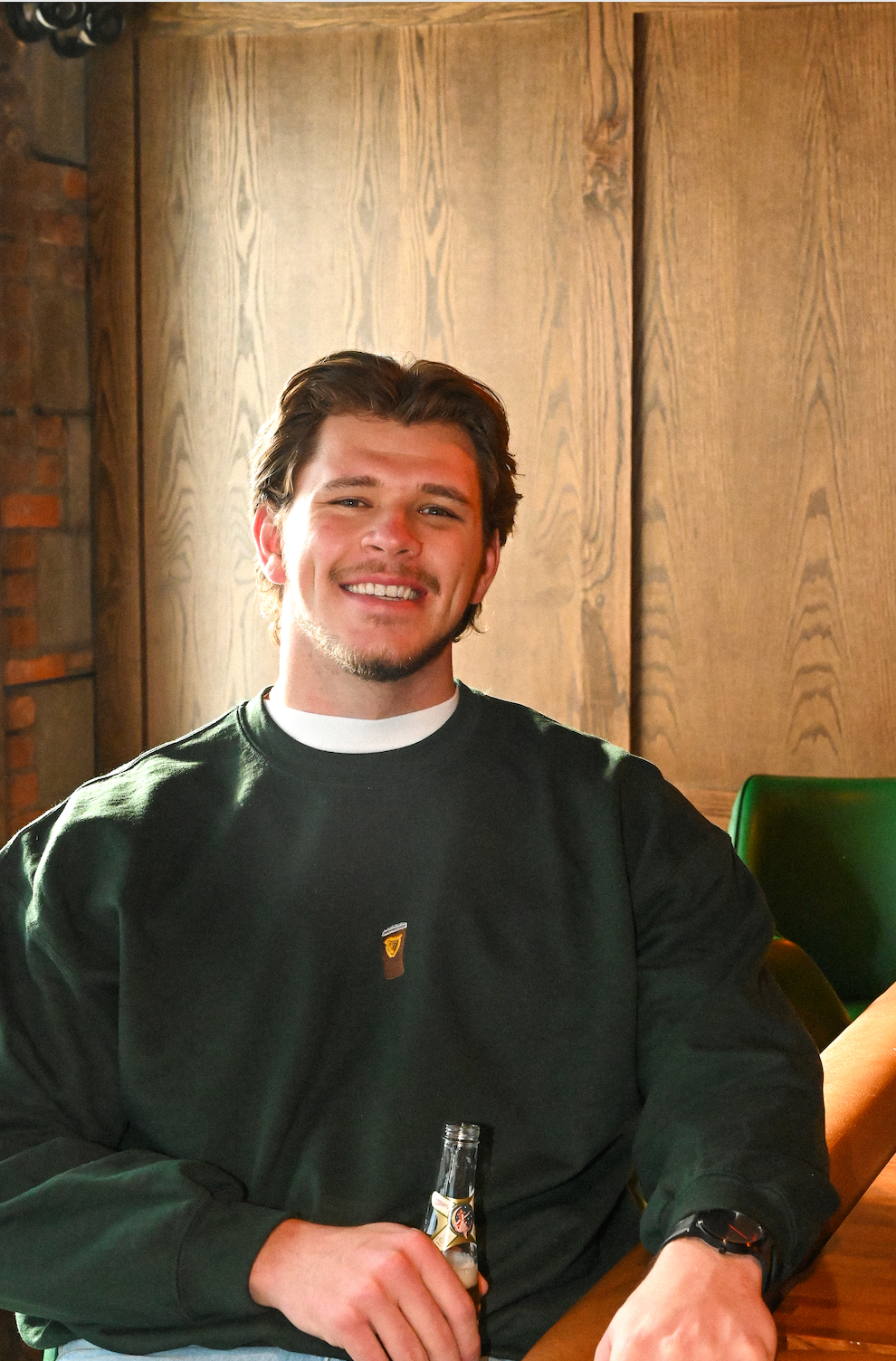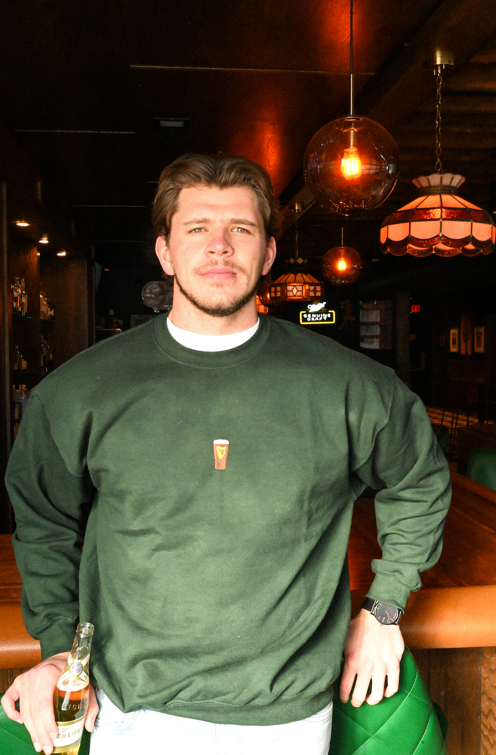 lil beer embroidered in the middle of a forest green crewneck sweatshirt